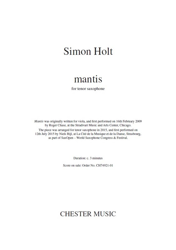Simon Holt: Mantis (Tenor Saxophone) Tenor Saxophone Instrumental Work